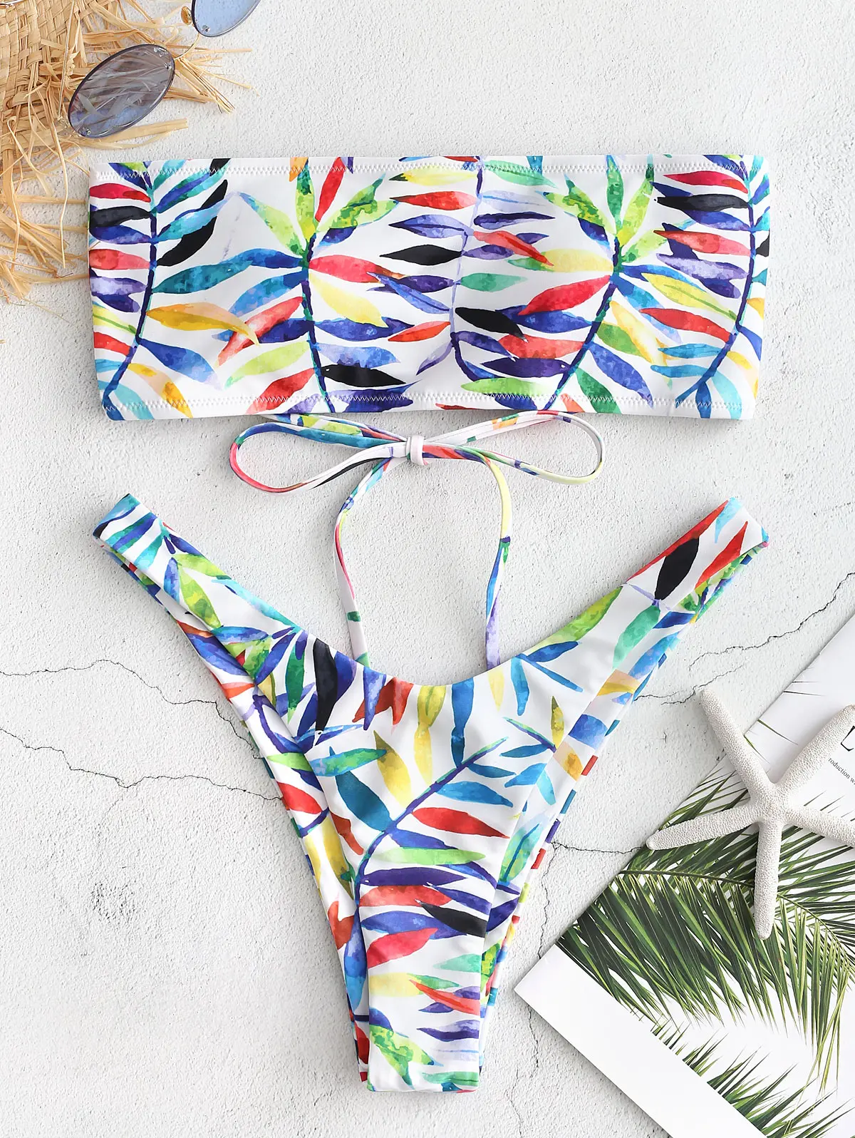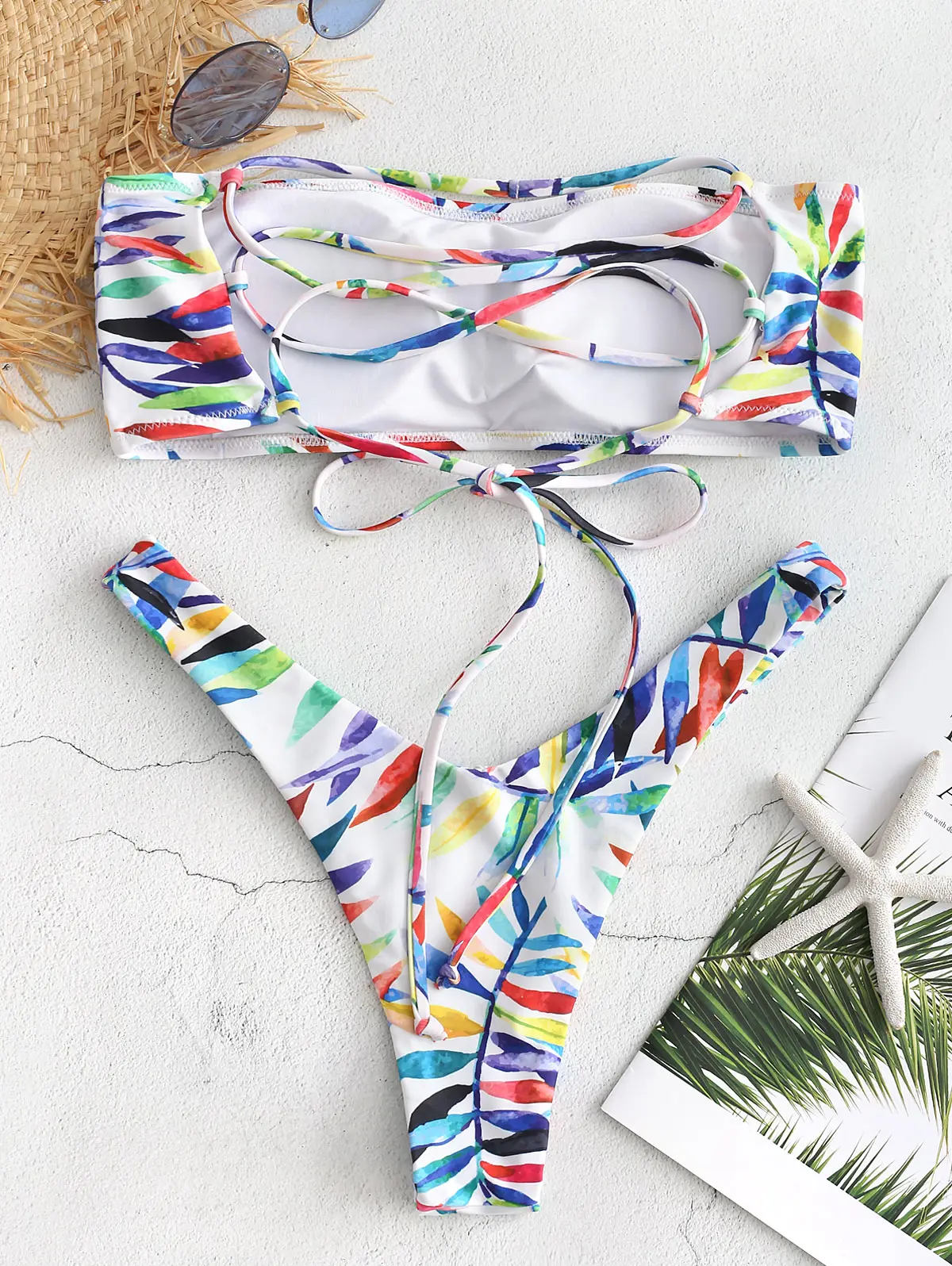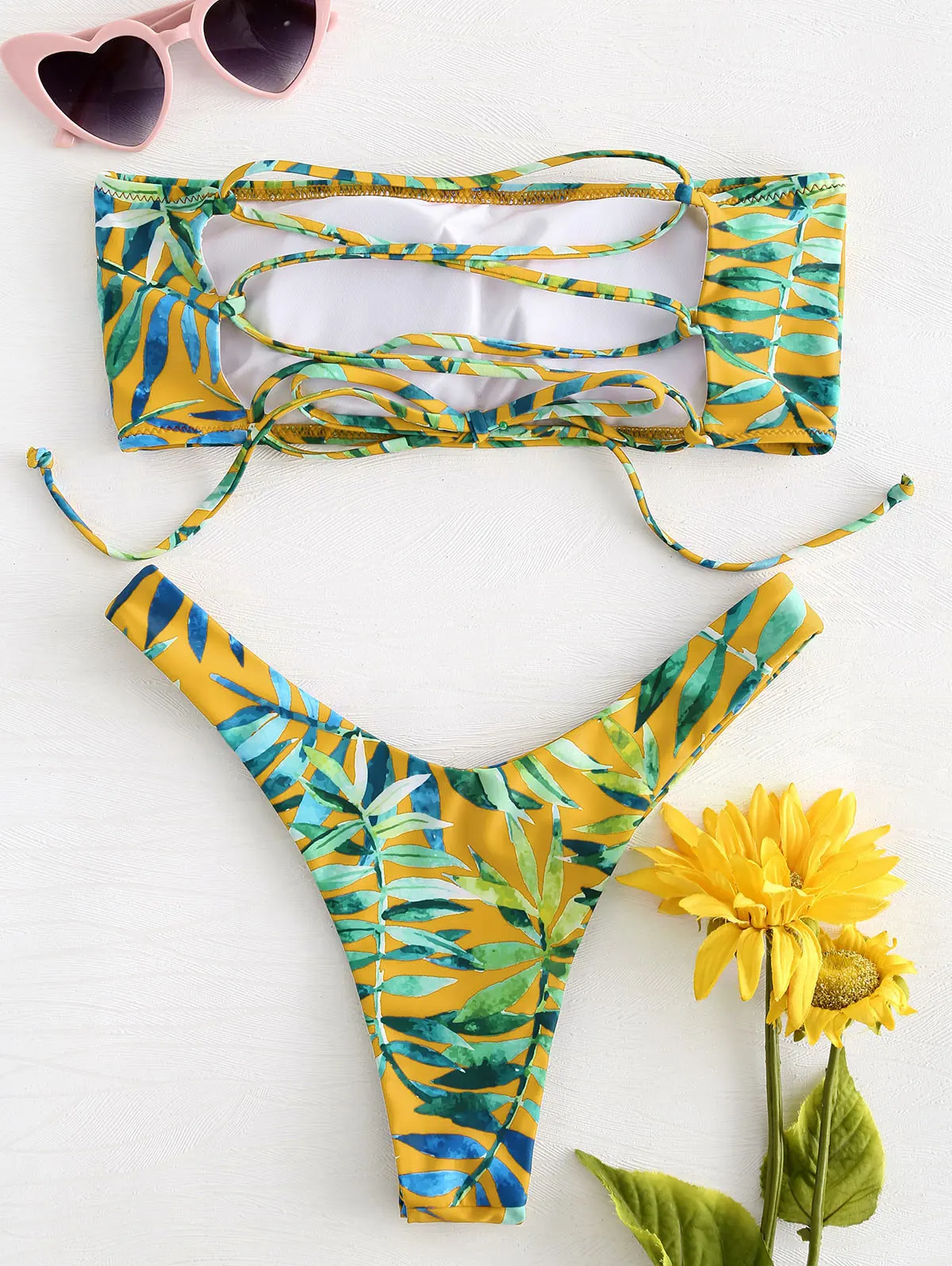 ZAFUL Leaf Print Lace-Up High Leg Bikini Set Strapless Bandeau Bikini Padded Maillot De Bain Beachwear Swimsuit Best Price