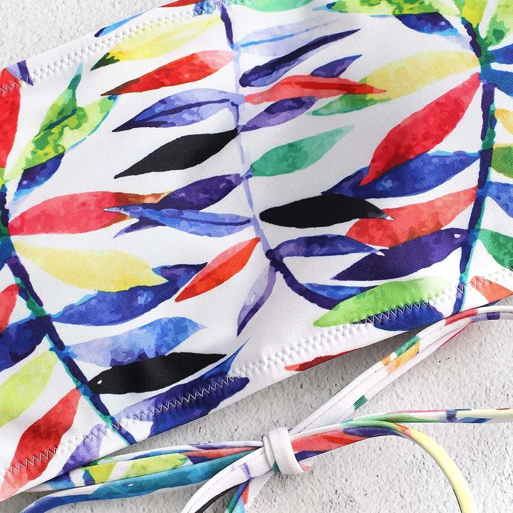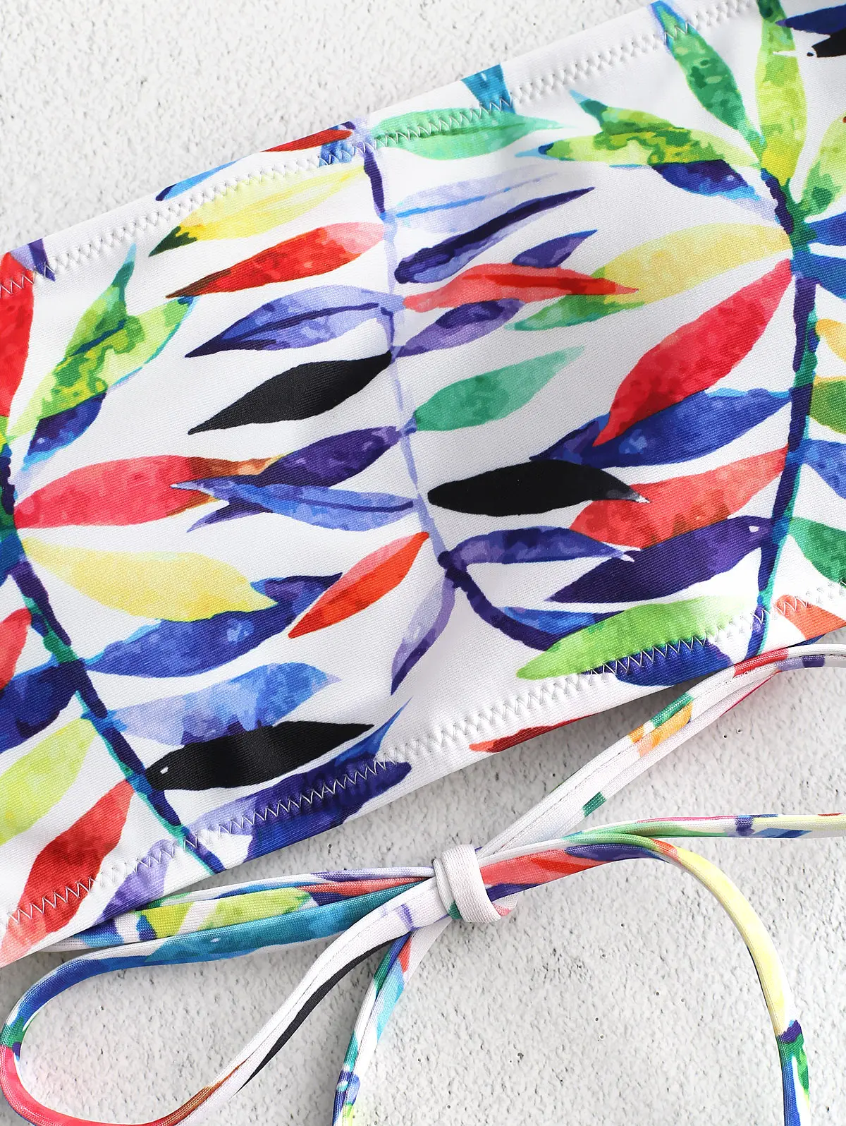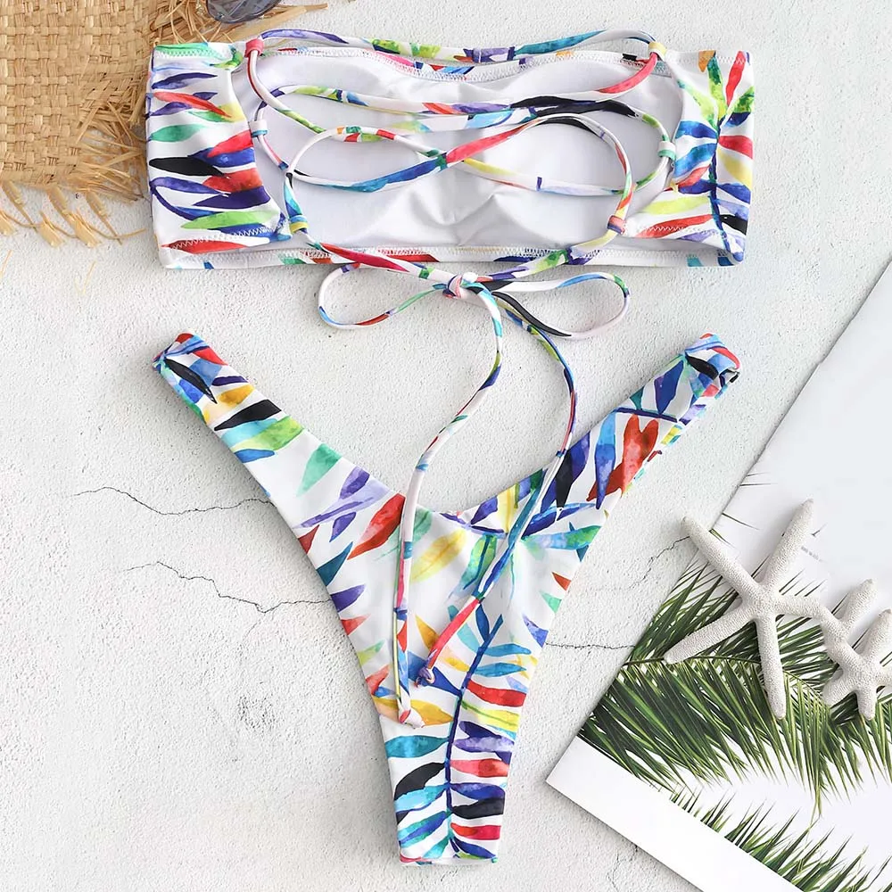 ZAFUL Leaf Print Lace-Up High Leg Bikini Set Strapless Bandeau Bikini Padded Maillot De Bain Beachwear Swimsuit Best Price