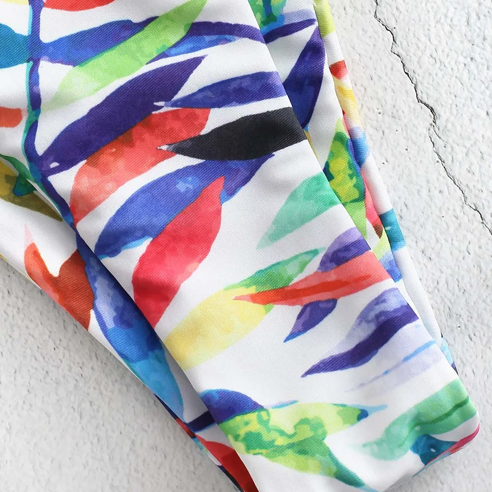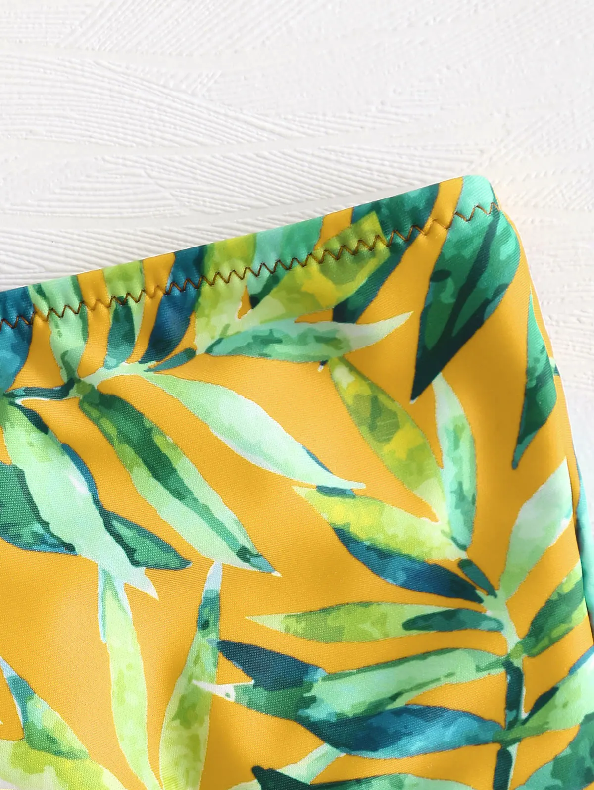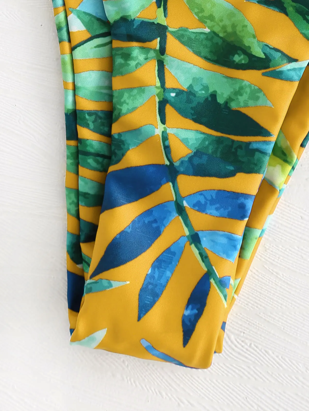 Covered in a vibrant-toned leaf pattern, the bandeau silhouette is