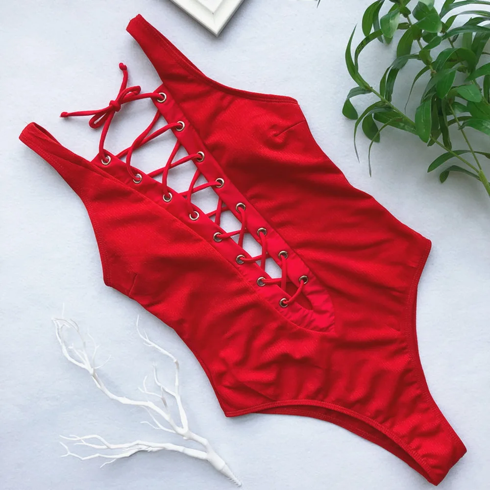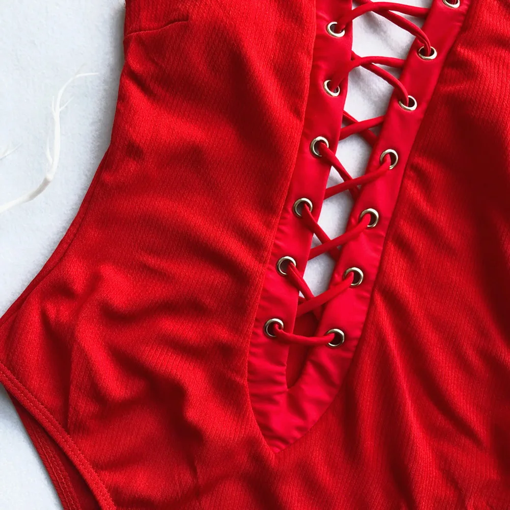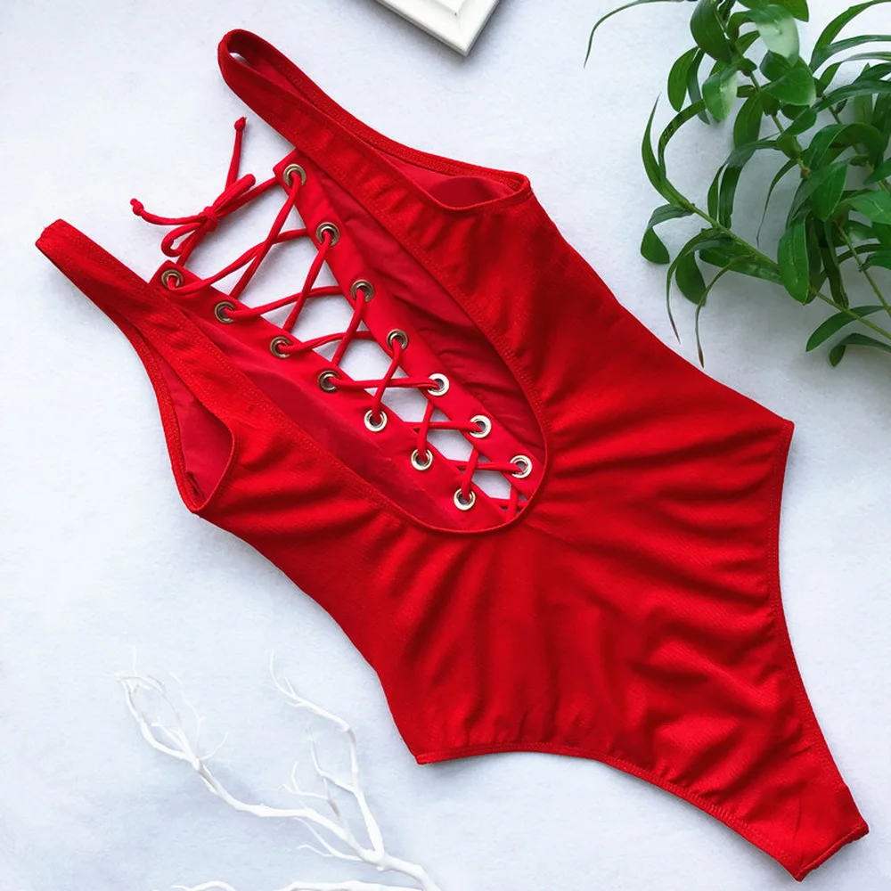 Solid One-Piece Swimsuit Bandage Women Swimwear Push Up Bathing Suit Deep V red Monokini Bodysuit Maillot De Bain swim suit Special Price