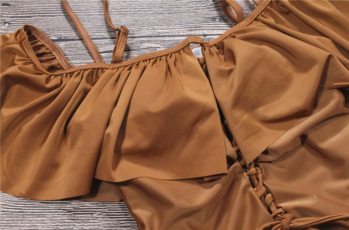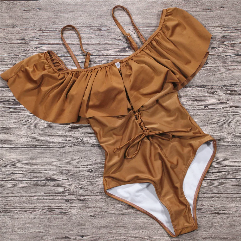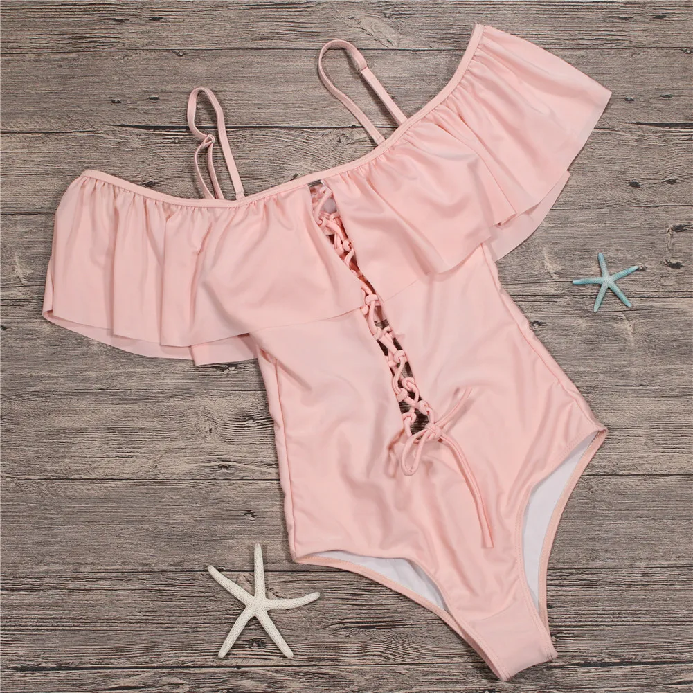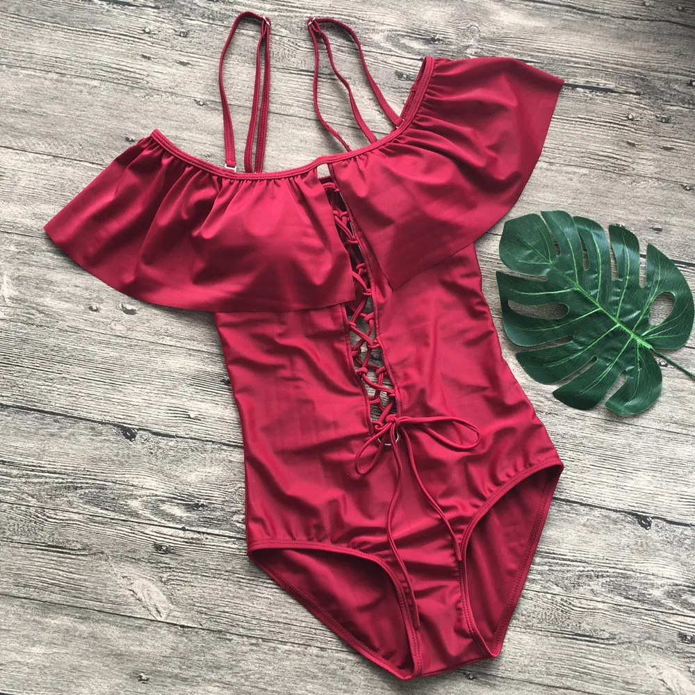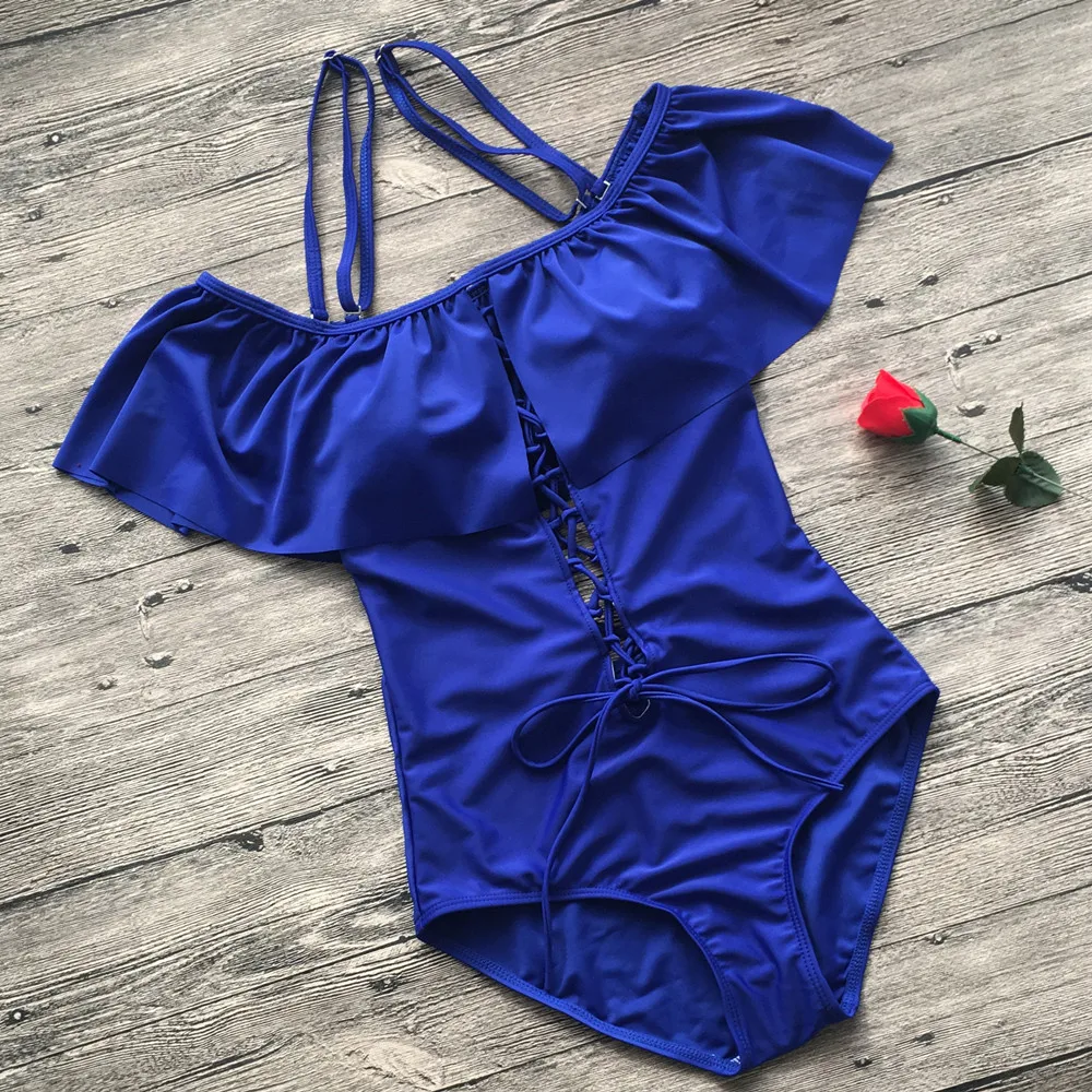 2018 Sexy One Piece Swimsuit Women Swimwear Off the Shoulder Monokini Ruffle Bodysuit Solid Swimsuit Bandage Cross Bathing Suit