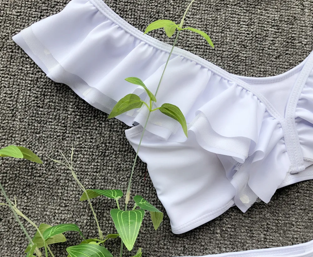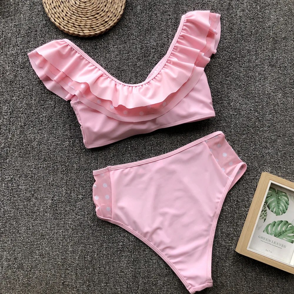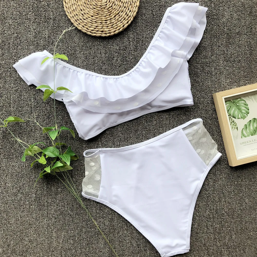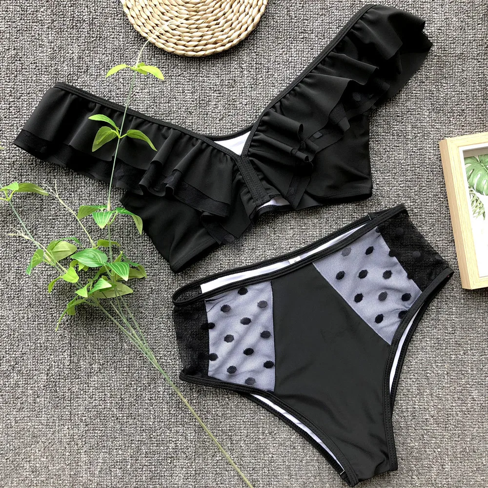 High Waist Bikini Set Sexy Off Shoulder Ruffles Bikini Women Dot Mesh Swimsuit Beach Wear Push Up Biquini Bathing Suit Swimwear
