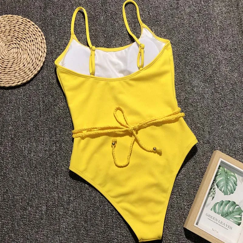 Hot Sale Yellow Backless One Piece Swimsuit Lady Sexy Bandage String Maillot de Bain Solid Padded Lady Brazilian Push Up 2017 Sexy One Piece Swim Suit for Women Hollow Monokini High Neck Beach Wear Bodysuit Ladies Bandage One Piece Swimsuit The swimsuit is featuring sleeveless, scoop neck, back cross strap, solid color, slim fit and one piece.