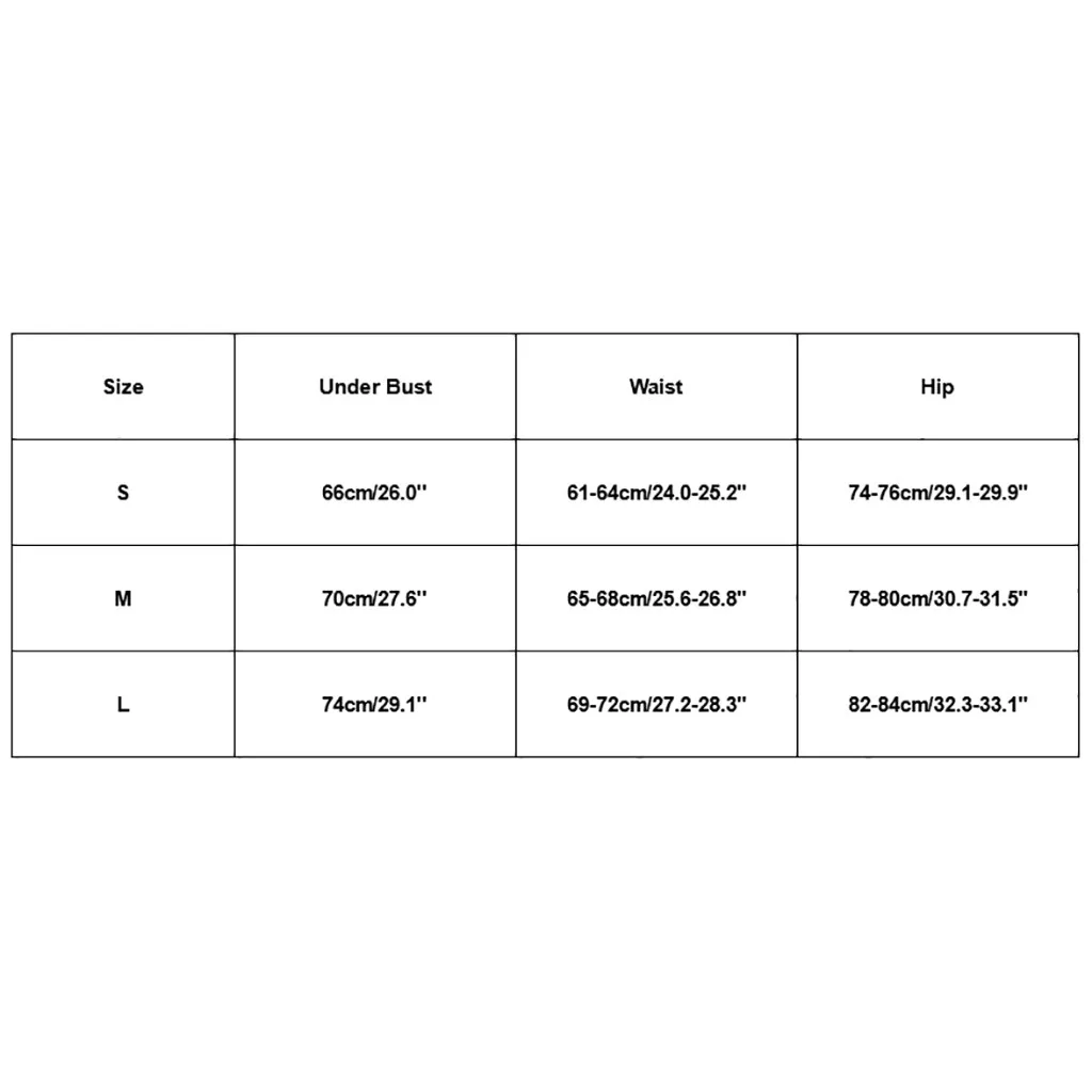 Size Under Bust Waist Hip S 66cm/26.0'' 61-64cm/24.0-25.2" 74-76cm/29.1-29.9" M 70cm/27.6'' 65-68cm/25.6-26.8" 78-80cm/30.7-31.5" L 74cm/29.1'' 69-72cm/27.2-28.3" 82-84cm/32.3-33.1"