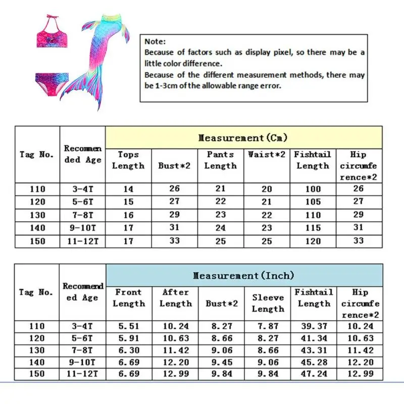 Mermaid Tail Swimsuit for Children Kids Swimwear Bikini Bathing Suit Swimsuit Swimming Costume Free Shipping Lots of fun will be had in this little mermaid outfit Material: Cotton,Polyester Gender: Girls Please compare your child's size to the chart Mermaid Tail Swimsuit for Children Kids Swimwear Bikini Bathing Suit Swimsuit Swimming Costume