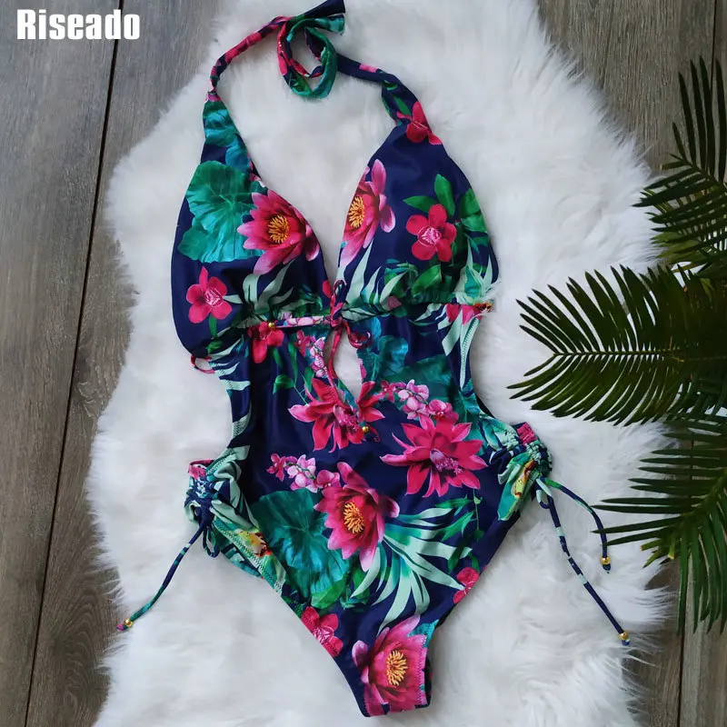 Riseado 2019 Swimwear Women Sexy Plunging One Piece Swimsuit monokini Halter Women Swimsuits Floral Printing Beachwear Best Offers